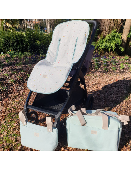 Selección de colchonetas, fundas para sillas de paseo con tu bebé en la silla, fundas para capotas o para el coche de bebé.
